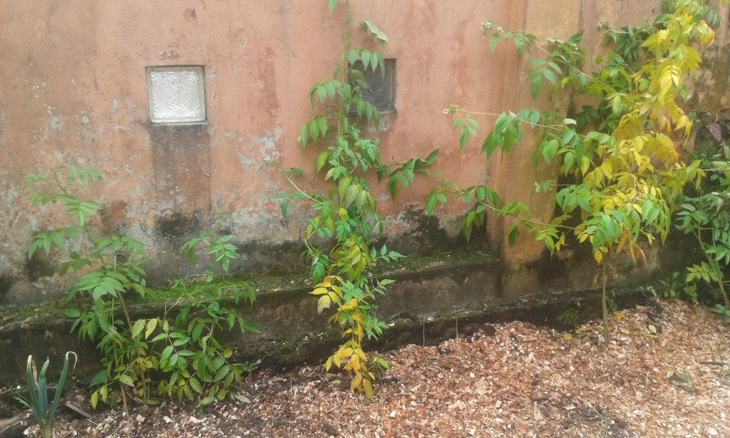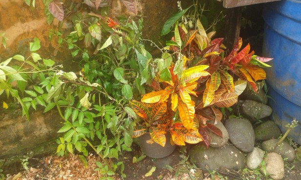 First of all, the onions are growing! The old, outer leaves are wilting and dying, but the bluish fingers in the center are growing, and the bulb-stalk in the top right wasn’t there before!A start of lemon grass, in Spanish called “hierba luisa”. It makes really good tea!Unfortunately, the raspberry bushes don’t seem to be doing very well. Maybe/hopefully some of them will grow back?A bucket of colorful cuttings that Mama is trying to sprout.A space-saving flower bed. “Flower wall”?The banana plant is noticeably yellower than it used to be, but the spinach is looking good. As for the elephant ear, it looks the same color it always is: purple!A pepper plant that Mama moved to the new garden (it used to sit by the front door).A cherry tomato plant that the spinach will just have to put up with!